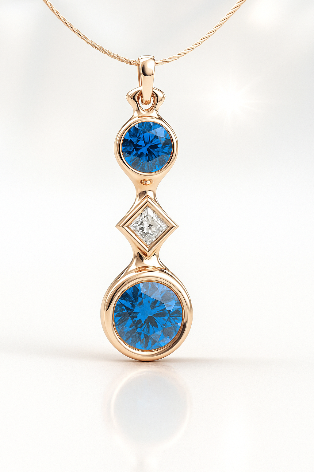 A medálban kettő darab kerek briliáns csiszolású kék gyémánt található, valamint egy princess csiszolású gyémánt. A gyémánt medál egyszerűen megrendelhető webshopunkban, vagy személyesen üzletünkben. A medál mellé ajándék díszdoboz választhat.