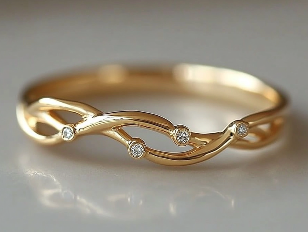 Magical 14 karat gold ringthat at the same time natural, lovely hatást, és szelíd eleganciát. A hullámzó formák a természet vonalait követik, akárcsak tavasszal a rügyező fák. A mesés ékszerttermészetes brilliant cut diamondtal díszítettük. A gyémántok közötti break decoration even more special makes this impressive yellow gold ring, which the Brillance of Hungarian Craft jewelry manufactory designer and ötvöseinek pride.