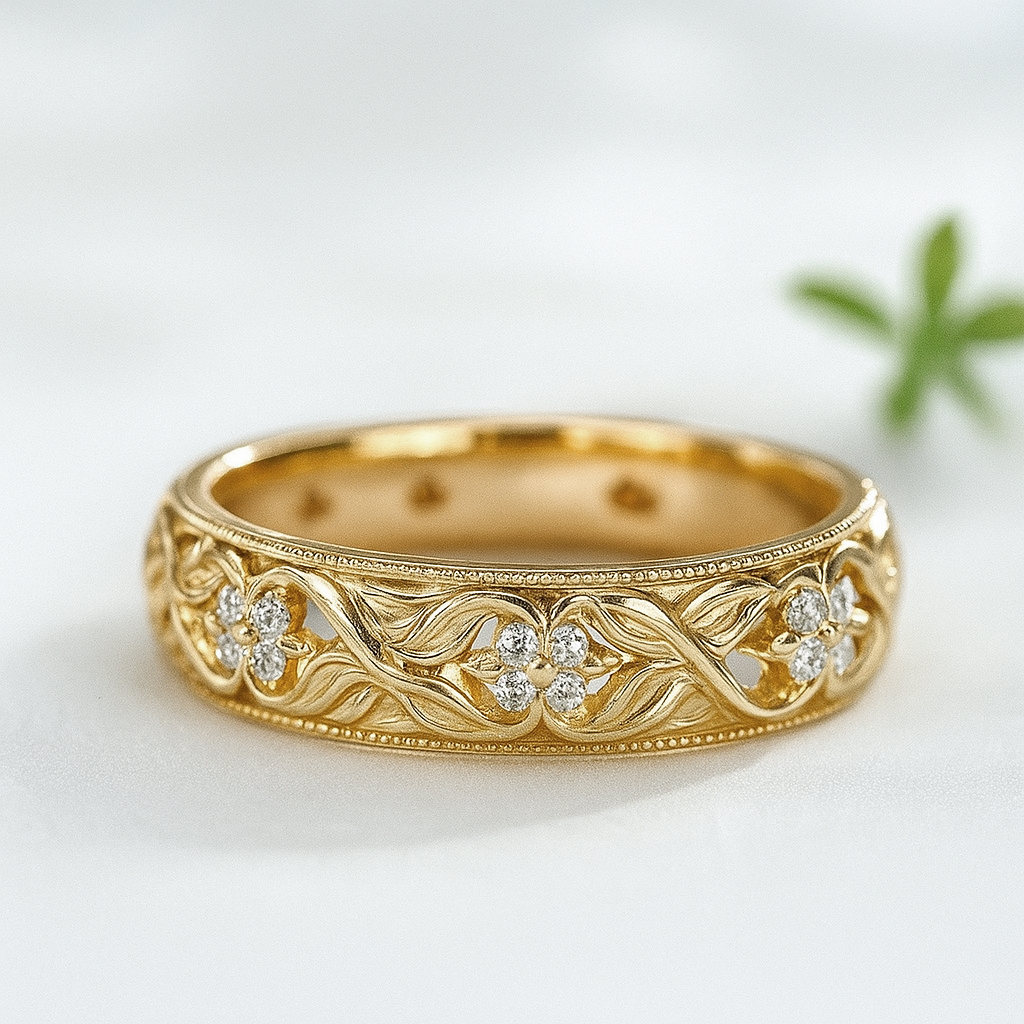 Firenze-5 prémium karikagyűrű: Arany jegygyűrű pár, finom díszítéssel az elegancia jegyében, természet ispirálta növényi motívumokkal