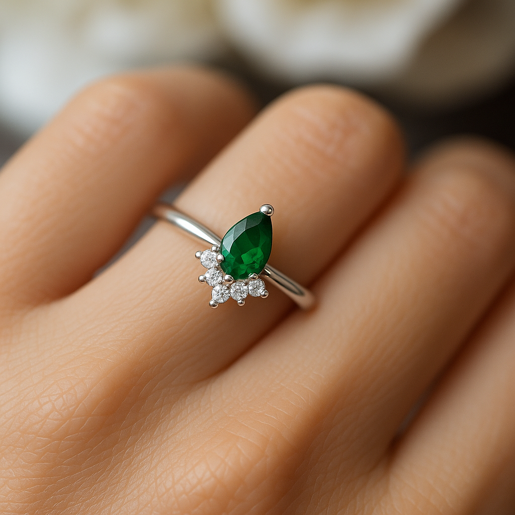 Arista smaragd gyűrű – Ennek a csodaszép 14 karátos arany gyémánt eljegyzési gyűrűnek a megtervezésekor a csepp alakot helyeztük előtérbe.