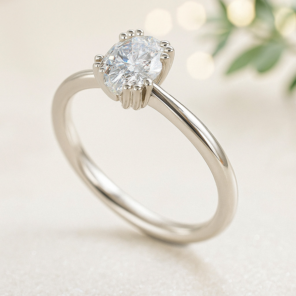 Egyedi megjelenésű 14 karátos arany eljegyzési gyűrű, ovális csiszolású természetes gyémánttal. A 0,30 ct tömegű, ovális csiszolású gyémántot egy különleges foglalat tartja, a szokásos négy karom helyett háromszor négy karom rögzíti a drágakövet. Ennek a kialakításnak köszönhetően biztonságos módon jut fény a gyémánthoz és emeli ki ragyogását. A letisztult, domború gyűrűsín nagyszerűen illik ehhez a nem minden napi, mesés foglalathoz és hagyja érvényesüli a gyémánt szépségét.