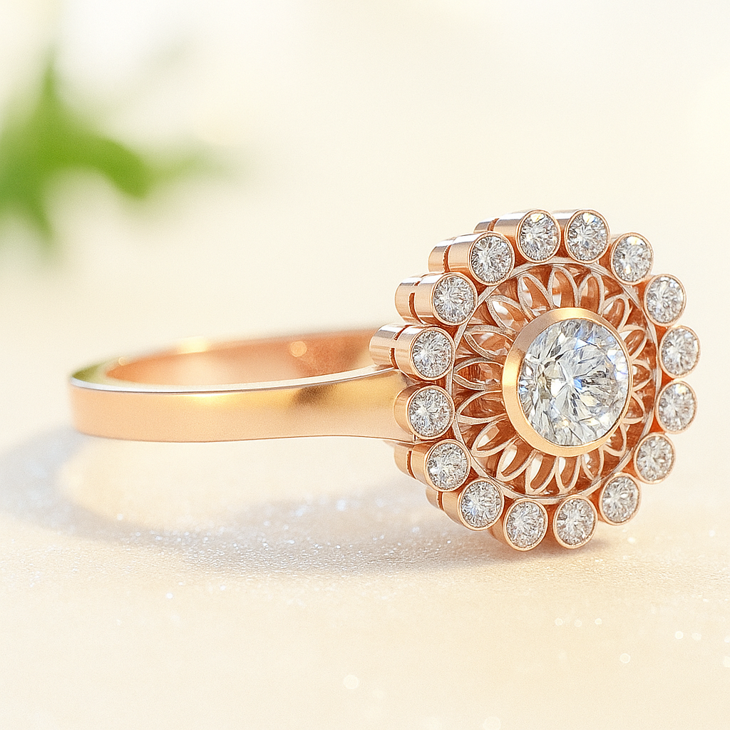 Kalliope: csodálatos, klasszikus, 14 karátos, sárga arany gyűrű, gyémánttal. Természet ihlette egyedi kézműves termék. Művészi megmunkálással készíült egyedi darab, melynek minden részlete gondos odafigyeléssel készül.