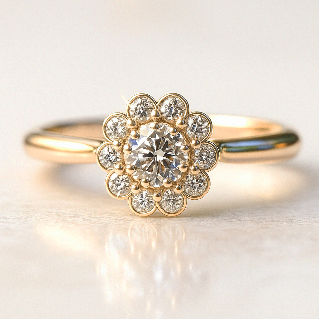 Levander gyémánt gyűrű – Bájosan természetes 14 karátos arany gyémánt eljegyzési gyűrű, melynek elképesztően csillogó foglalatát virágszirmok inspirálták