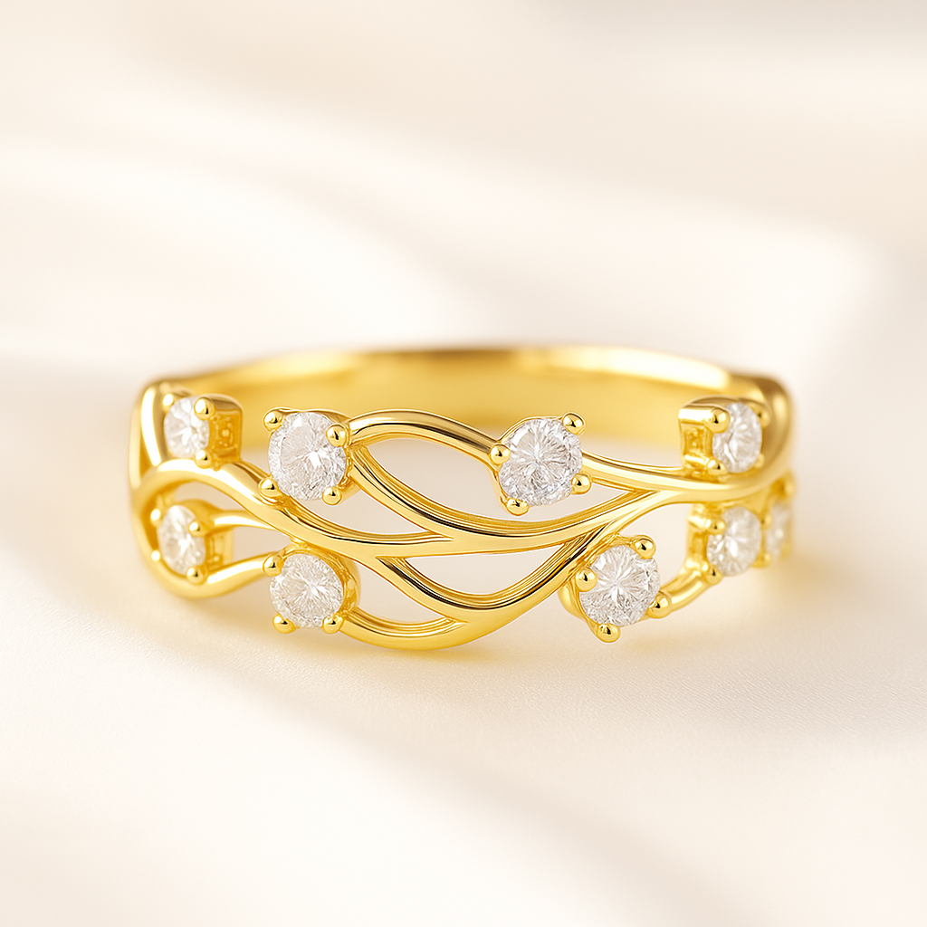 Varázslatos 14 karátos arany gyűrű, ami egyszerre kelt természetes, bájos hatást, és szelíd eleganciát. A hullámzó formák a természet vonalait követik, akárcsak tavasszal a rügyező fák. A mesés ékszert 8 darab 1,7 mm átmérőjű briliáns csiszolású gyémánttal díszítettük. A gyémántok közötti áttört díszítés még különlegesebbé teszi ezt a lehengerlő sárga arany gyűrűt, mely a Brillancy Magyar Kézműves Ékszermanufaktúra tervezőjének és ötvöseinek büszkesége.