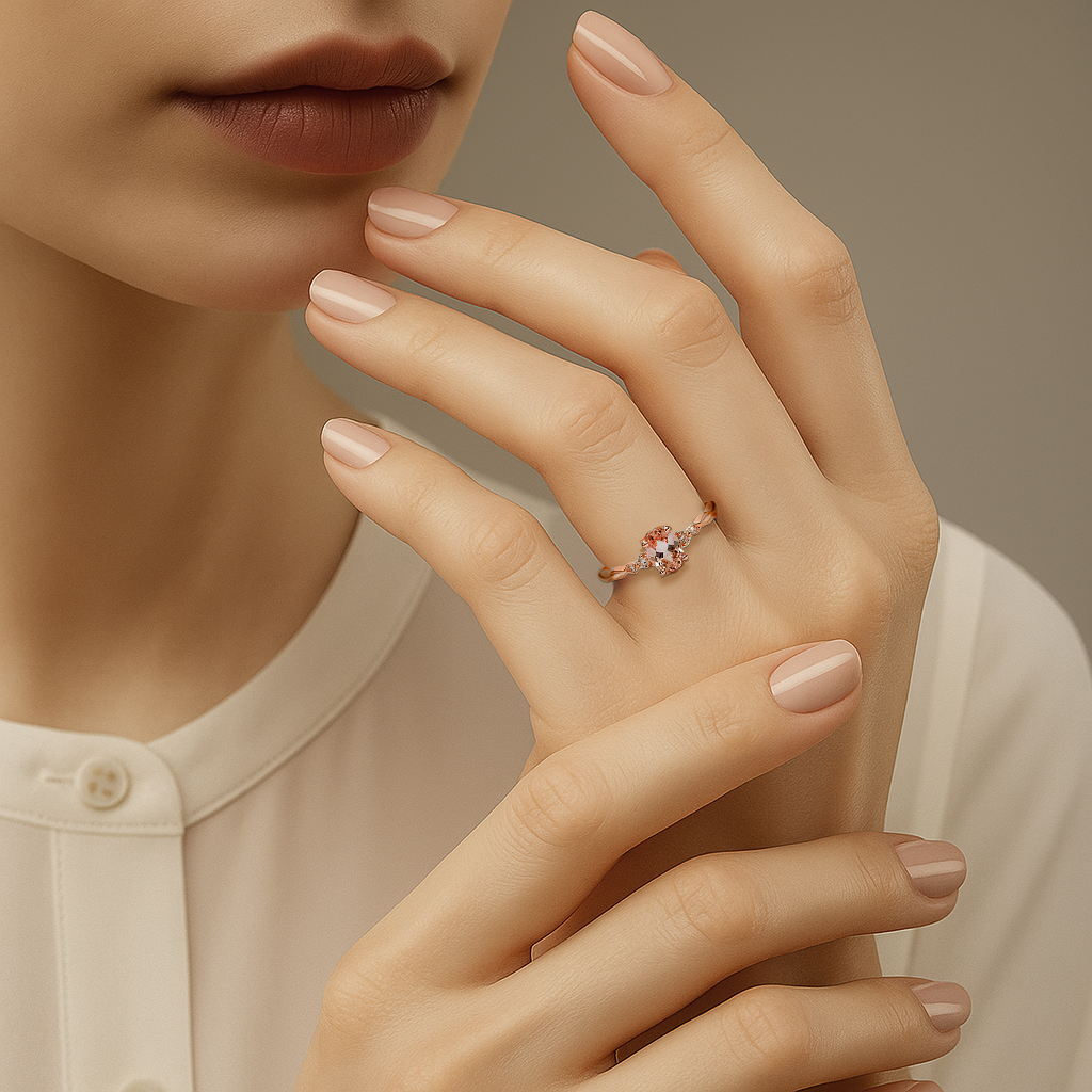Látványos, és bájos megjelenésű 14 karátos arany gyűrű melyet oldalt négy briliáns csiszolású fehér gyémánt és egy barackos rózsaszínű ovális turmalin ékesít. Finom, kecses vonalvezetése teljesen elvarázsolja a hölgyeket.