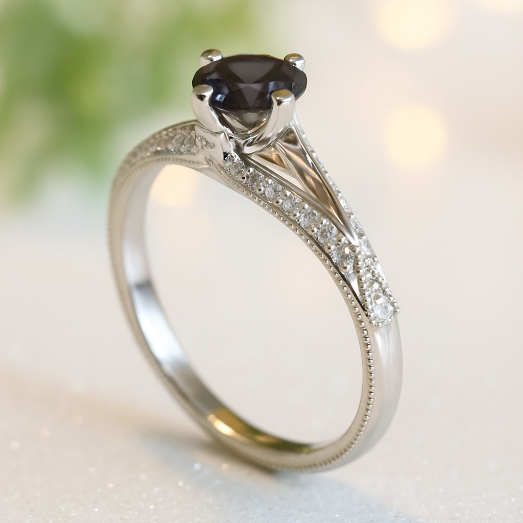 Bámulatos formatervezésű, 14 karátos fehérarany gyémánt eljegyzési gyűrű, melynek külseje mindenkit elvarázsol. Egyedei tervezésű gyűrűsínjében, összesen 35 darab brill kő található, mely kontrasztot állít egymással, az egész ékszer tündököl, akár egy ragyogó meteorit. A páratlan kialakítású, négy karmos, erős foglalatban egy 0,50 ct-os, briliáns csiszolású fekete gyémánt foglalta el méltó helyét. Ezen kívül 34 darab apróbb briliáns csiszolású fehér gyémánt ragyog, melyek tömege összesen 0,16 ct.