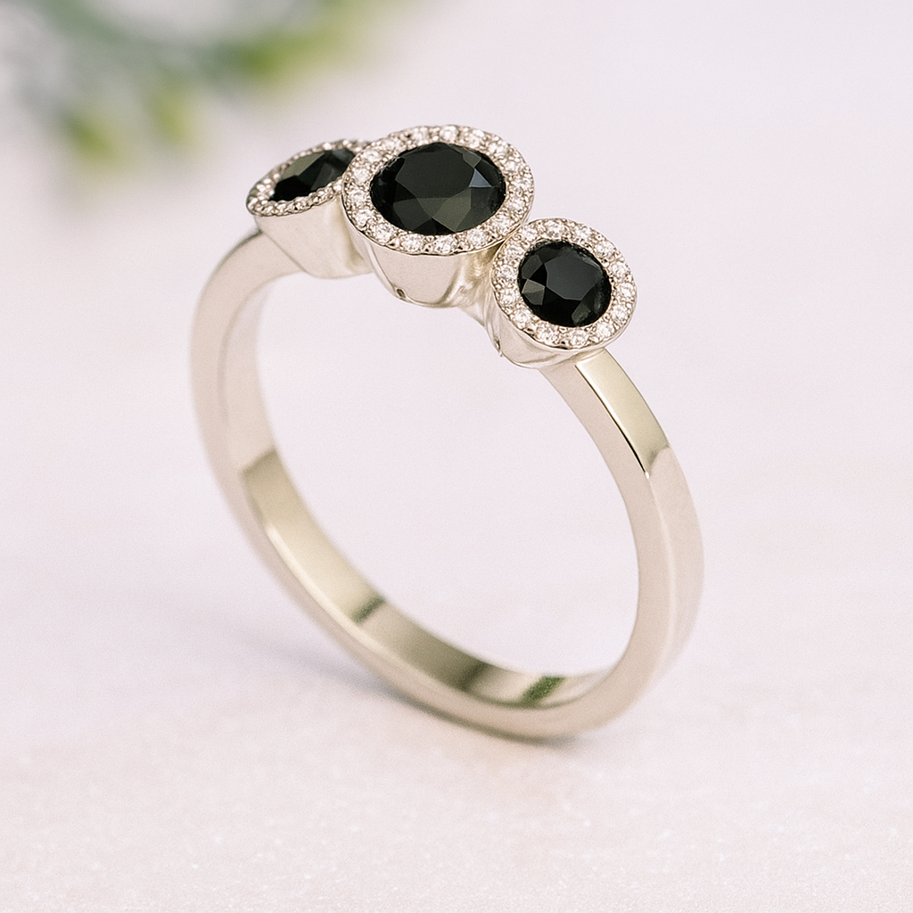 A feketén ragyogó három nagyobb gyémántot összesen 50 darab kisebb, 0,8 mm átmérőjű fehér gyémánt veszi körül. Az összhatás szemet kápráztató! Aprólékos munkával készül a Brillancy Magyar Kézműves Ékszermanufaktúra csapatától, hogy szerencsés viselőjét Királynőként díszítse!