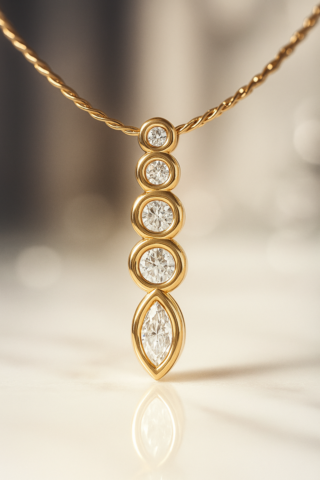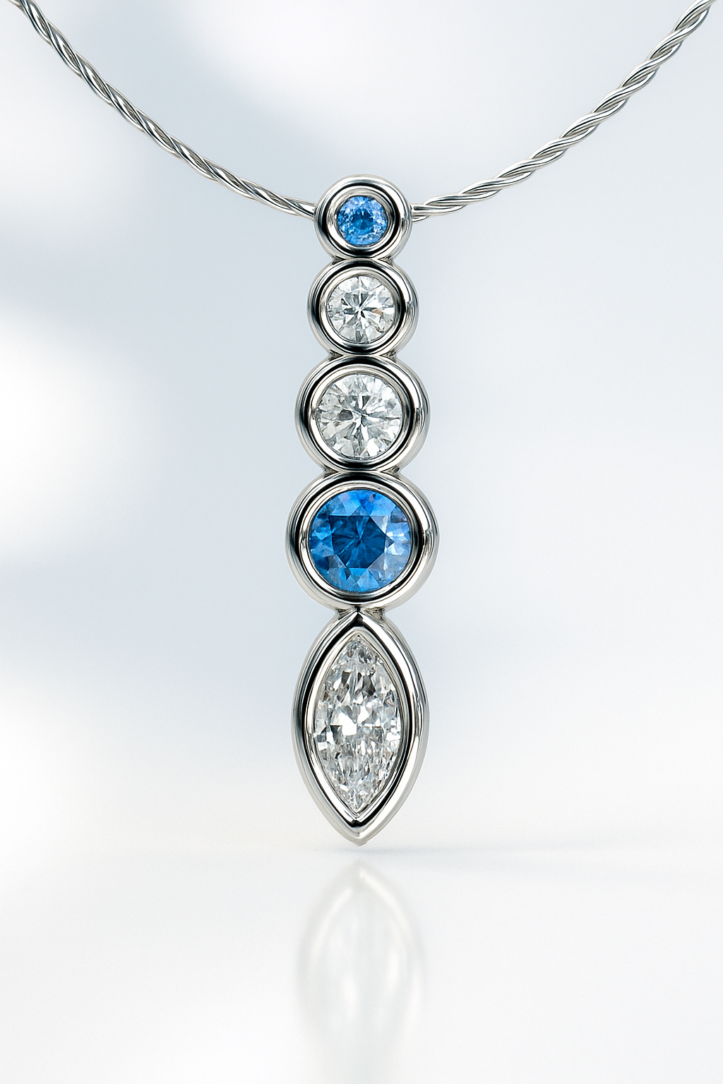 Valse – Elegáns Gyémánt Medál – Kifinomultság, könnyedség, elegancia jellemzik ezt a fantasztikus ékszercsodát, melyet 4 darab kerek briliáns csiszolású és egy darab navett gyémánt díszít. A kék és fehér színek tündöklő játéka.