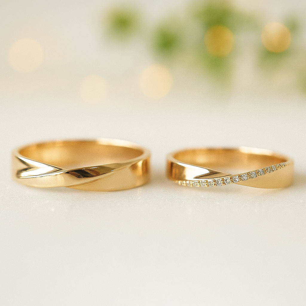 Tekeredett, romantikus , gyémánt karikagyűrű pár. Polírozott felületének köszönhetően, az egész gyűrű egy káprázatos fényes csillogást kap. A gyűrű pár nő felében, összesen huszonegy darab, briliáns csiszolású gyémánt található, egy vésett járatban. A brillek, bár nem a gyűrűtest teljes felületén találhatóak, mégis esztétikailag úgy lettek elhelyezve, mintha az egész gyűrűt körülölelnék. A gyémánt jegygyűrű pár belső domborúsága, kényelmes viseletet biztosít a mindennapok során.